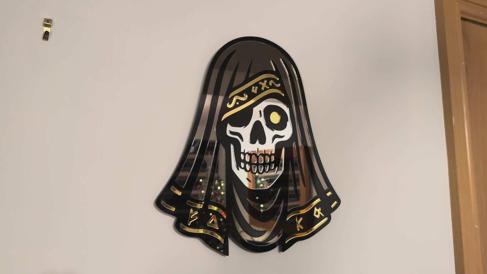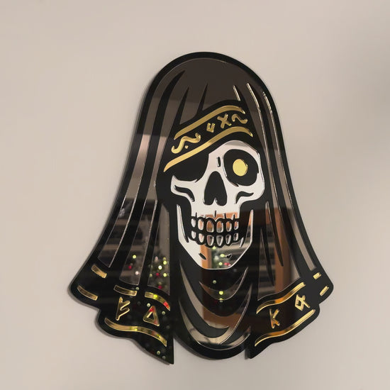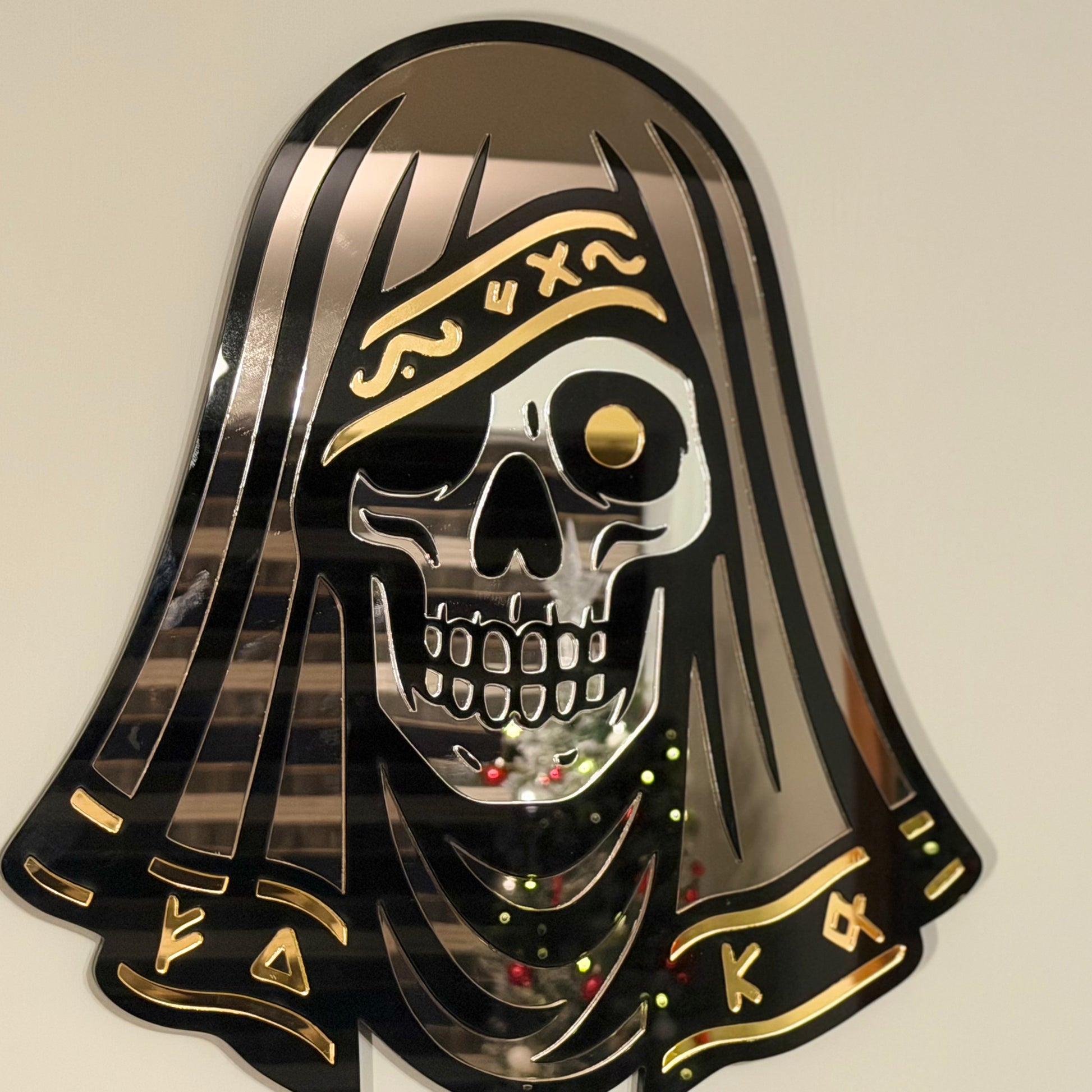 Step into the realm between worlds with The Veiled Skull — a striking piece of laser-cut wall art crafted in layered gold, silver, and bronze mirror acrylic, framed by bold gloss-black linework. This piece is designed to capture light, shadow, and the timeless mystery of the afterlife.