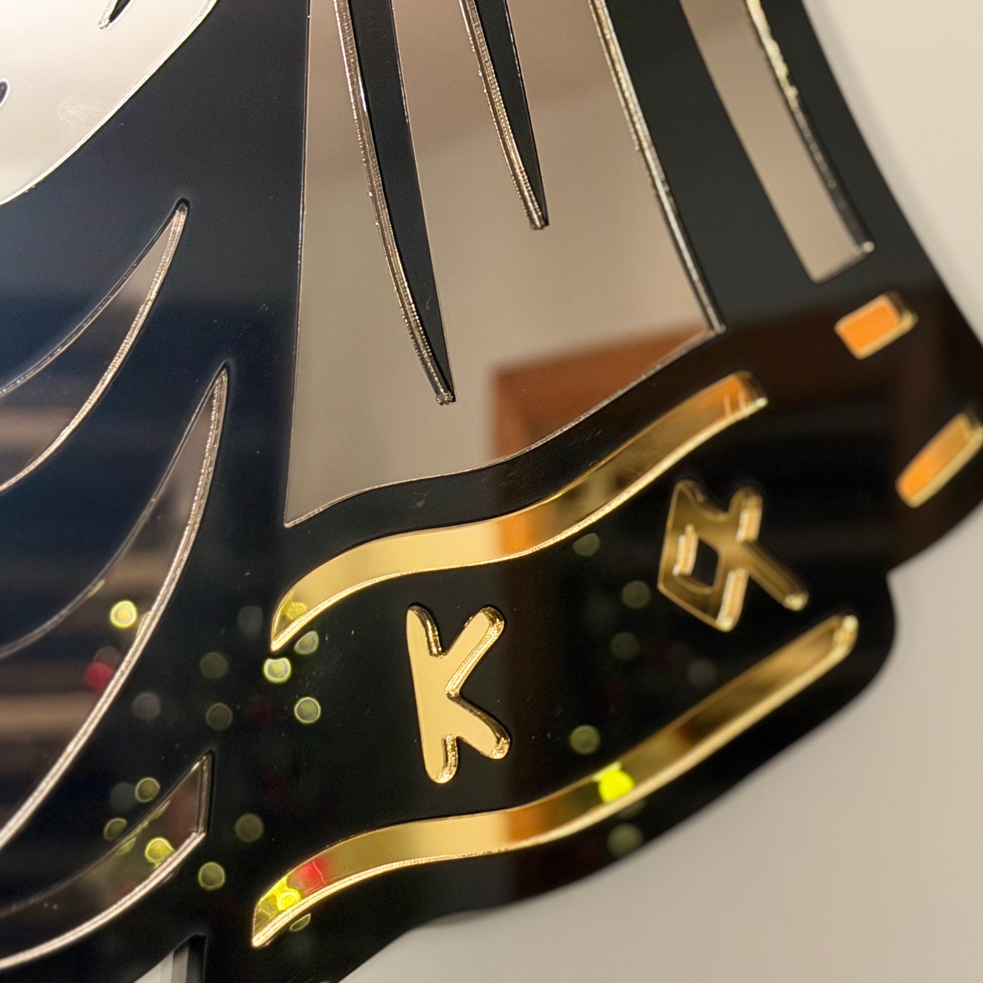 - Crafted from gold, silver, and bronze mirror acrylic with bold black detailing